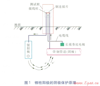 陰極保護(hù)分犧牲陽極陰極保護(hù)法和外加電流陰極保護(hù)法。綠博公司主管道采用的是犧牲陽極陰極保護(hù)法,其原理就是原電池的原理,是將一種比鐵更活潑的鎂陽極與被保護(hù)的鋼管相連接,通過鎂陽極的不斷氧化反應(yīng),向被保護(hù)的鋼管提供保護(hù)電子,使其獲得保護(hù)。犧牲陽極陰極保護(hù)原理見圖l。