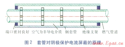 穿越公路、鐵路的燃?xì)夤艿腊凑赵O(shè)計(jì)要求,施工時要加設(shè)套管,并且套管與主管之間要用絕緣的支架支撐,套管兩端用柔性的防水材料封堵,防止地下水進(jìn)入套管內(nèi)使主管道發(fā)生腐蝕。在對管道防腐情況的檢測中我們發(fā)現(xiàn),嚴(yán)格按照規(guī)范要求施工的管道,并不能阻止管道腐蝕的發(fā)生,并且越是加設(shè)套管的地方,主管道發(fā)生腐蝕的情況越嚴(yán)重。為了查明原因,根據(jù)檢測情況,我們有針對性地挖出幾處腐蝕嚴(yán)重的地方,通過查閱相關(guān)資料,并聘請專家現(xiàn)場實(shí)地踏勘、分析,終于弄清了問題的癥結(jié)。套管內(nèi)主管道能夠得到有效陰極保護(hù)的必要條件是主管道與套管之間存在導(dǎo)電介質(zhì),而我們嚴(yán)格按照規(guī)范施工的管道,套管與主管道之間設(shè)絕緣支架,套管兩端防水密封良好,套管與主管道之間的介質(zhì)是空氣,然而正是由于兩端密封好,地下水不能進(jìn)入,空氣也不能導(dǎo)電,導(dǎo)致沒有導(dǎo)電介質(zhì)。主管道雖然加設(shè)陰極保護(hù),但陰極保護(hù)電流受空氣層阻斷被完全屏蔽,不能起到任何作用,這就是套管對陰極保護(hù)電流產(chǎn)生了屏蔽[2]。另外,主管道在穿越套管施工時,人工拖、拽等操作經(jīng)常破壞主管道的防腐層,如果我們沒有及時發(fā)現(xiàn)并修補(bǔ)防腐層,管道埋地投用后,主管道雖然加設(shè)了陰極保護(hù)裝置,但因?yàn)樘坠軐﹃帢O保護(hù)電流的屏蔽,陰極保護(hù)不起作用,這樣套管內(nèi)主管道的破損處會處于自然氧化、腐蝕的狀態(tài),進(jìn)而腐蝕會逐步蔓延,這就是越加設(shè)套管的地方,主管道腐蝕越嚴(yán)重的原因。套管對陰極保護(hù)電流屏蔽的原理見圖2。