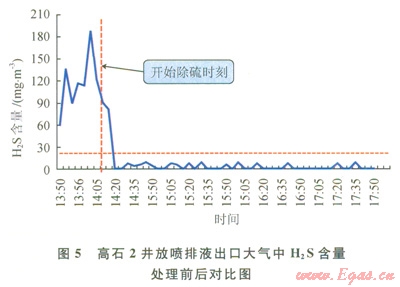 含硫井排出液自動(dòng)實(shí)時(shí)處理流程(圖4)和]二藝技術(shù)目前已經(jīng)在川渝地區(qū)多口井開(kāi)展應(yīng)用,效果顯著(圖5),如高石2井在排液期間,采用該技術(shù)對(duì)井筒產(chǎn)出液進(jìn)行處理前,放噴出口大氣環(huán)境中H2S含量主要維持在115~173mg/m3范圍內(nèi),而應(yīng)用該技術(shù)后,放噴出口大氣環(huán)境中H2S含量降低到8.65mg/m3以?xún)?nèi),可以滿足井場(chǎng)人員連續(xù)作業(yè)的要求。