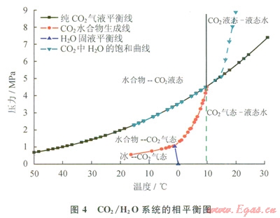 CO2/H2O系統(tǒng)的相平衡如圖4所示。該相圖的繪制基于CO2飽和水的混合物。游離水的出現(xiàn)將促使水合物的生成。水合物也可以在高于CO2/H2O系統(tǒng)水露點(diǎn)的條件下形成。形成CO2水合物的必要條件為:①合適的壓力和溫度(低溫、高壓);②出現(xiàn)水合物形成分子;③適量的水。此外,湍流擾動(dòng)可加速水合物的生成,尤其是在節(jié)流閥處、存在成核點(diǎn)(如焊接點(diǎn)和管道配件)或存在游離水條件下。
