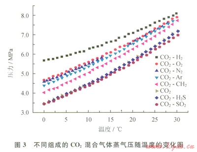 從圖l可以看出,與純CO2相比,SO2是唯一增加CO2混合氣體密度的組分,H2S對(duì) CO2混合氣體密度影響最小,而H2對(duì)CO2混合氣體密度影響最大。
