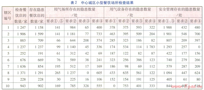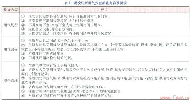 自2012年11月山西壽陽火鍋店發(fā)生燃?xì)獗ㄊ鹿屎?,武漢市立即開展對(duì)餐飲場(chǎng)所的用氣安全檢查。按武漢市出臺(tái)的《商用燃?xì)庠罹咴O(shè)施安裝及驗(yàn)收技術(shù)規(guī)程》(以下簡(jiǎn)稱《規(guī)程》)的規(guī)定,使用管道氣的餐飲場(chǎng)所在通氣前須進(jìn)行驗(yàn)收,且管道氣供氣單位須定期上門對(duì)用氣場(chǎng)所進(jìn)行安全檢查。因此,此次用氣安全檢查的重點(diǎn)是使用瓶裝氣的餐飲場(chǎng)所。根據(jù)GB 50028—2006《城鎮(zhèn)燃?xì)庠O(shè)計(jì)規(guī)范》、CJJ 94—2009《城鎮(zhèn)燃?xì)馐覂?nèi)工程施工與質(zhì)量驗(yàn)收規(guī)范》、《規(guī)程》等對(duì)瓶裝氣用氣場(chǎng)所提出的安全要求,制定了餐飲場(chǎng)所用氣安全檢查的內(nèi)容及要求(見表l)。