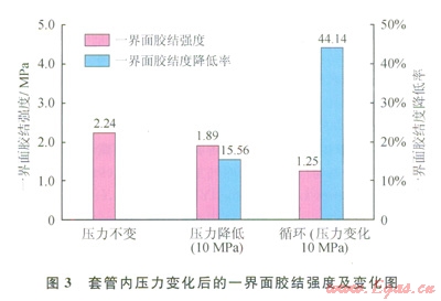 按照本文參考文獻(xiàn)[20]的方法制作固井封固系統(tǒng)模型,測(cè)試套管內(nèi)壓力變化對(duì)界面剪切膠結(jié)強(qiáng)度的影響。模型l制作完成后,模擬套管內(nèi)壓力不變的情況;模型2制作完成后,模擬套管內(nèi)壓力降低10MPa的情況;模型3制作完成后,模擬套管內(nèi)壓力循環(huán)變化的情況,變化幅度為l0MPa。測(cè)量并計(jì)算上述封固系統(tǒng)模型的一界面膠結(jié)強(qiáng)度,并分別以套管內(nèi)壓力不變時(shí)的一組模型的界面膠結(jié)強(qiáng)度為標(biāo)準(zhǔn),計(jì)算分析套管內(nèi)壓力變化時(shí)的一界面膠結(jié)強(qiáng)度變化(3)
