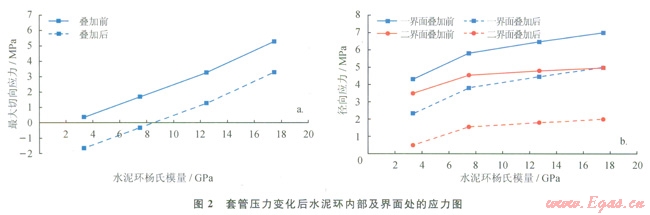 由圖4-a圖看出,水泥環(huán)內(nèi)的最大Von Miscs應(yīng)力隨水泥環(huán)楊氏模量的增大而增大;與初始應(yīng)力替加后,Von Mises應(yīng)力增大為4.48.0MPa,小于普通水泥環(huán)的屈服強(qiáng)度。所以,當(dāng)溫度變化幅度不大時(shí),水泥環(huán)通常不會(huì)發(fā)生屈服破壞,但溫度升高幅度較大時(shí)水泥環(huán)可能會(huì)發(fā)生屈服破壞。因此,對(duì)熱采井等應(yīng)避免使用膨脹水泥漿,且應(yīng)使用低楊氏模量的水泥環(huán)。由圖4-b可以看出,與初始應(yīng)力疊加前,一、二界面在徑向上受拉伸應(yīng)力的作用且應(yīng)力隨水泥環(huán)的楊氏模量增大而增大,為4.48.0MPa,遠(yuǎn)大于一、二界面膠結(jié)的抗拉強(qiáng)度,會(huì)破壞一、二界面膠結(jié);與初始應(yīng)力疊加后,徑向應(yīng)力顯著降低至1.46.0MPa,降低了一、二界面膠結(jié)破壞的風(fēng)險(xiǎn)。因此,通過降低水泥環(huán)楊氏模量和增大初始應(yīng)力都可以降低界面膠結(jié)破壞的風(fēng)險(xiǎn),建議采用較低楊氏模量的水泥環(huán)或使用膨脹水泥來預(yù)防失效。