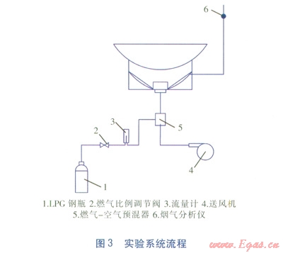 新型炒菜灶與傳統(tǒng)炒菜灶的實驗系統(tǒng)基本一致。實驗裝置包括LPG鋼瓶、煙氣分析儀、燃氣比例調(diào)節(jié)閥、流量計、電子溫度計等。煙氣分析儀用于測量煙氣中CO體積分數(shù),燃氣比例調(diào)節(jié)閥用于調(diào)節(jié)控制LPG的流量,流量計用于計量LPG累計流量。實驗系統(tǒng)流程見圖3。