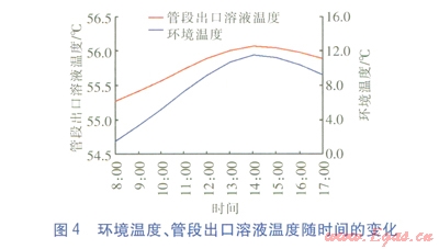 其他條件不變,采用長(zhǎng)沙典型年1月1日8:00—17:00的逐時(shí)室外干球溫度作為環(huán)境溫度,對(duì)管段0-4出口溶液溫度進(jìn)行仿真計(jì)算。環(huán)境溫度、管段出Vl溶液溫度隨時(shí)間的變化見圖4。由圖4可知,計(jì)算工況下,環(huán)境溫度從最低(1.5℃)升至最高(11.5℃),管段0-4出口溶液溫度由55.27℃升至56.07℃。