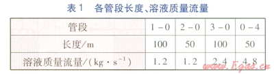 各管段長(zhǎng)度、溶液質(zhì)量流量見表1。設(shè)定節(jié)點(diǎn)1~3處溶液溫度均為60℃,管段1-0、2-0、3-0溶液質(zhì)量分?jǐn)?shù)分別為41%、38%、41%,環(huán)境溫度為5℃,各管段單位長(zhǎng)度散熱系數(shù)均取2W/(m·K)。