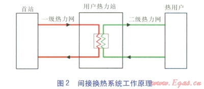 圖2中,一級(jí)熱力管網(wǎng)的高溫水和二級(jí)熱力管網(wǎng)的低溫水在用戶熱力站經(jīng)過(guò)換熱器間接換熱后供給熱用戶。而混水系統(tǒng)中(見(jiàn)圖l),一級(jí)熱力管網(wǎng)的高溫水和二級(jí)熱力管網(wǎng)的低溫水在用戶熱力站不經(jīng)過(guò)換熱器,而是直接混合后供給熱用戶。與間接換熱系統(tǒng)相比,混水系統(tǒng)更容易因?yàn)樗疁氐耐蝗簧叨a(chǎn)生氣體。