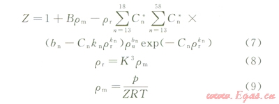 式中Z為天然氣壓縮因子;B為第二維利系數(shù);rm為摩爾密度(單位體積的摩爾數(shù));rr為對比密度;bn、Cn、kn為常數(shù);Cn*為溫度與組成函數(shù)的系數(shù);K為混合物體積參數(shù);R為氣體摩爾常數(shù)。