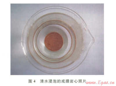 實驗表明:當成膜液濃度達200kg/m3后,巖心在成膜液中浸泡10s就能在表面形成防滲膜(圖1)。因此,從成膜效果和成本考慮,成膜液濃度300~400kg/m3為最優(yōu)加量。
