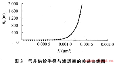 根據(jù)對不同滲流條件下的供給半徑定量研究表明(見圖2),滲透率小于1×10-3μm2的儲層,供給半徑在300m左右;當滲透率大于1.2×10-3μm2時供給半徑就明顯增加。從圖2中看出:當K介于1.2×10-3~1.4×110-3μm2,供給半徑為600~2000m;當滲透率大于等于1.4×10-3μm2,供給半徑急劇增加,供給半徑在2000m以上。這說明氣藏的非均質(zhì)性對氣井供氣范圍影響大,井網(wǎng)密度應不一樣。沙罐坪、云和寨北區(qū)、臥龍河石炭系氣藏大部分井滲透率小于1×10-3μm2,根據(jù)計算井距在300~2000km,從目前采出程度較高、非均質(zhì)性較強的福成寨、張家場石炭系來看,井距1~2km,從理論和實際開發(fā)效果對比認為,沙罐坪、云和寨北區(qū)、臥龍河石炭系氣藏平均井距在1km左右為最好。