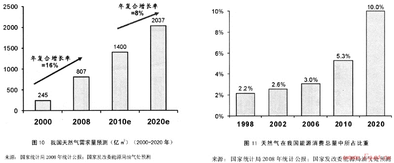 綜上所述,我國天然氣行業(yè)未來幾年仍將保持高速增長。國家發(fā)改委能源局油氣處預(yù)測未來天然氣需求仍將保持快速增長,2010年天然氣需求將達到1400億m3,2020年將達到2037億m3,2010年至2020年復(fù)合增長率達到8%(見圖10)。此外,天然氣在中國能源消費總量構(gòu)成中的占比逐年提高,預(yù)計到2010年將達到5.3%,到2020年將達到10%(見圖11)。