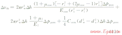 根據(jù)模型假設(shè)④套管、水泥漿、地層緊密相連無(wú)間隙,且結(jié)合假設(shè)①忽略熱膨脹效應(yīng)可得,水泥漿總體積變化量應(yīng)等于套管和井壁圍巖體積恢復(fù)膨脹量,即