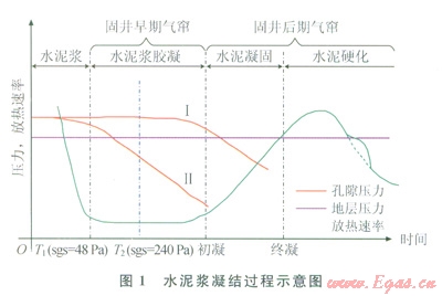 隨著水化反應(yīng)的進(jìn)行,液態(tài)水泥漿逐漸凝固成固態(tài)水泥石需經(jīng)歷液相、膠凝、凝固和硬化等4個(gè)階段[15](圖1)。液態(tài)水泥漿能夠完全傳遞孔隙壓力,不會(huì)發(fā)生氣竄;膠凝態(tài)水泥漿不斷形成膠凝結(jié)構(gòu),發(fā)生塑性體積收縮,引起孔隙壓力逐漸降低;初凝后,水泥漿進(jìn)入凝固、硬化階段,表現(xiàn)出固態(tài)特征,滲透率極低,能有效阻止水泥環(huán)本體氣竄[16-17]。南上述研究分析可知,固井早期氣竄包括兩個(gè)階段:靜膠凝強(qiáng)度過(guò)渡時(shí)間(T1至T2);靜膠凝強(qiáng)度過(guò)渡時(shí)間結(jié)束時(shí)刻至初凝(T2至初凝)。