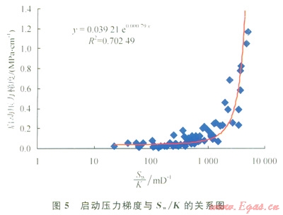 巖石孔隙介質(zhì)中,由于氣水潤(rùn)濕性的差異和毛細(xì)管壓力的作用,水優(yōu)先占據(jù)小孔喉和孔隙壁面,并且由于氣體的易壓縮性,其在含水的孔隙中流動(dòng)時(shí),首先選擇大的孔隙,隨著流動(dòng)壓差的增大,逐漸驅(qū)動(dòng)小一些吼道的水或使孔隙壁面的水膜變薄,在未形成連續(xù)氣流的孔喉處氣體前沿呈跳躍式前行,且容易被水卡斷[17],這就是氣體在含水孔隙介質(zhì)中流動(dòng)存在啟動(dòng)壓力梯度的微觀機(jī)理。表現(xiàn)在滲流曲線上,流量與壓差并不呈線性關(guān)系,通過數(shù)據(jù)擬合可以求出不同含水飽和度時(shí)的啟動(dòng)壓力,除以巖樣長(zhǎng)度即為啟動(dòng)壓力梯度,將全部巖樣的實(shí)驗(yàn)數(shù)據(jù)繪于同一圖上(圖4),發(fā)現(xiàn)啟動(dòng)壓力梯度隨含水飽和度增大而增大,且?guī)r樣滲透率越小,這種趨勢(shì)越明顯,當(dāng)含水飽和度大于50%以后,啟動(dòng)壓力梯度明顯增大。進(jìn)一步通過數(shù)據(jù)分析發(fā)現(xiàn),啟動(dòng)壓力梯度與含水飽和度和滲透率的比值(Sw/K)具有很好的相關(guān)性(圖5),呈以下的指數(shù)函數(shù)關(guān)系: