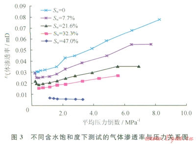 前人研究表明[14-16],致密砂巖中由于復(fù)雜的孔隙結(jié)構(gòu),氣體滲流存在非達(dá)西特征。筆者通過氣驅(qū)水實(shí)驗(yàn)分析表明,當(dāng)驅(qū)替壓差較小時(shí),氣體不能驅(qū)動(dòng)水形成流動(dòng),只有當(dāng)驅(qū)替壓差大于某一臨界值,足以克服水鎖產(chǎn)生的毛細(xì)管阻力才能發(fā)生流動(dòng),這在滲流曲線上表現(xiàn)為啟動(dòng)壓差。對(duì)同一巖樣,其含水飽和度越高,氣體始流動(dòng)所需的驅(qū)動(dòng)壓差越大,氣體開始流動(dòng)后,驅(qū)替壓差越大流量越大;巖樣含水飽和度越低,相同驅(qū)替壓差下流量越大。但是,壓差增大滲透率不一定變大,當(dāng)巖樣含水飽和度較高時(shí),隨著驅(qū)替壓差的增大(平均壓力倒數(shù)減小),氣體滲透率有的增加,有的減?。划?dāng)巖樣含水飽和度較低時(shí),隨著驅(qū)替壓差的增大(平均壓力倒數(shù)減小),氣體滲透率普遍呈先降低后增加的特點(diǎn),這是因?yàn)榍捌谥饕芑撔?yīng)的影響,而后期,當(dāng)平均壓力倒數(shù)低于一定程度后(即驅(qū)替壓差大于一定值后),這時(shí)氣體帶動(dòng)部分孔隙中的水流動(dòng),或使孔隙壁的水膜變薄,氣體滲流通道增加。因此氣體滲透率開始增加(圖3)。含水飽和度越高,這種水的可動(dòng)性對(duì)氣體滲流的影響越明顯。