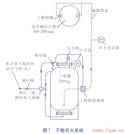 干粉滅火系統(tǒng)主要由氮氣瓶組、減壓閥、干粉罐、管路系統(tǒng)及噴嘴等組成,見圖1。