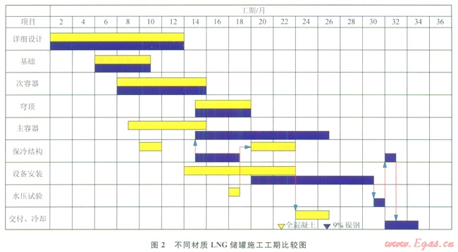 全混凝土罐的應用有很多優(yōu)點。首先,從材料角度講,國內的9%鎳鋼材市場緊張,且9%鎳鋼雖已初步實現(xiàn)國產化,但價格依然昂貴。與之相比,混凝土材料容易獲得,成本較低。其次,全混凝土罐的平行施工工序多,建造工期短(圖2),因工期產生的費用相對較低(圖3)。從圖2可以看出,全混凝土內罐與外罐的平行施工搭接時間長,保冷結構安裝與設備安裝可同時進;對于9%鎳鋼,外罐施工即將結束時才能進行內罐施工,保冷結構安裝與設備安裝不存在搭接時間。常規(guī)的16×104m3儲罐工期約為33個月,而全混凝土罐的建造工期約為25個月,可節(jié)省工期8個月。工期縮短可使LNG儲罐提前投產,也間接減小了LNG儲罐建造費用。從圖3可以看出,采用全混凝土LNG儲罐至少可節(jié)約20%的建造成本[3]。最后,全混凝土LNG罐可以擴大業(yè)主對承包商與設計單位的選擇范圍,優(yōu)化LNG儲罐的設計與建造市場。同時混凝土的應用在全球經驗都較為成熟,人們對混凝土低溫特性的認識也逐漸走向成熟[4]。