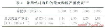 針對以上分析,根據(jù)常用的Æ127.0mm和Æ139.7mm鉆具曲線圖,反算出常用的鉆桿容許的最大井眼曲率如表4,可在現(xiàn)場使用參考。以此表格對比發(fā)生失效的4口井的情況(表2),可知其造斜點(diǎn)處的狗腿度均超過了容許限度,茍西003-Hl更是達(dá)到了6.24°/30m。