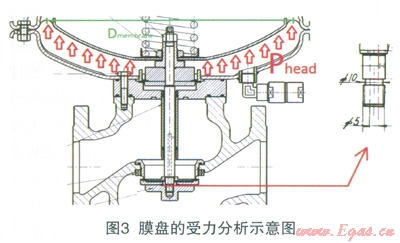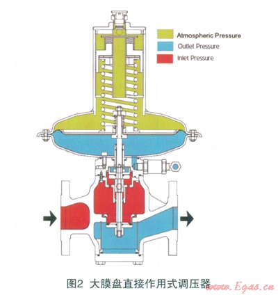 該款調(diào)壓器為某進(jìn)口品牌,在我公司大量使用,其質(zhì)量和性能較為穩(wěn)定,一直沒有出現(xiàn)過問題。該款調(diào)壓器為大膜盤直接作用式調(diào)壓器,其連接口徑DN80,膜盤頭部直徑為書600,其結(jié)構(gòu)型式平衡閥芯式調(diào)壓器,閥瓣位于閥座下部,是典型的失效開啟型調(diào)壓器,在主皮膜破裂或壓力信號管無壓力反饋時,閥口處于開啟狀態(tài)。大膜盤調(diào)壓器的特點是結(jié)構(gòu)簡單、響應(yīng)迅速、關(guān)閉精度高,由于大膜盤的作用,其關(guān)閉精度很高,當(dāng)下游壓力高于設(shè)定值時,閥口關(guān)閉密封性好,無流量泄漏。其結(jié)構(gòu)見圖2。