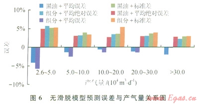 無(wú)滑脫模型各項(xiàng)誤差次之(圖4),組分模型計(jì)算誤差大于黑油模型,是由于Govier-Fogarasi用的凝析氣井液氣比為0.05~14.4m3/104m3,從黑油模型對(duì)所選模型(無(wú)滑脫、Gray和Hagedorn&Brown沒(méi)有劃分流型)計(jì)算流型看:Mukherjee&Brill和Orkiszewski所有井井簡(jiǎn)全部為段塞流,Hasan&Kabir預(yù)測(cè)結(jié)果除5井次出現(xiàn)分散泡狀流以外,其余井全為環(huán)狀流。段塞流為一段氣一段液,而環(huán)狀流主要靠氣相中攜帶的液滴和氣相與管壁液膜的摩擦帶液。因此兩種流型的滑脫損失均較小,可以采用無(wú)滑脫模型計(jì)算壓降。從分段液氣比看,液氣比小于0.5m3/104m3,誤差較大,這主要是由于氣液比極高,舉升壓降極小,13口壓降梯度平均為1.74MPa/1000m,導(dǎo)致井底流壓(13口井底流壓平均13.4MPa)較小,即使計(jì)算的井底流壓誤差較小因井底流壓測(cè)壓值較小而誤差較大。隨著液氣比的增加,各項(xiàng)誤差逐漸增加(圖5)?,F(xiàn)考慮各項(xiàng)誤差限為5%,采用無(wú)滑脫模型的液氣比范圍為0.5~5m3/104m3,并對(duì)該氣液比條件下的產(chǎn)氣量進(jìn)行了分段統(tǒng)計(jì)如圖6所示,隨著產(chǎn)氣量的增加,各項(xiàng)誤差逐漸下降。因此無(wú)滑脫模型按黑油計(jì)算適用條件為:液氣比0.5~5m3/104m3,產(chǎn)氣量大于5×104m3/d,井底流壓誤差小于5%。