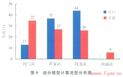 從所選的4個(gè)氣液兩相流模型(Hagedorn&Brown、Orkiszewski、Mukherjee&Brill、Hasan&Kabir)看,Hagedorn&Brown模型各項(xiàng)誤差最小,按組分模型計(jì)算的誤差明顯小于黑油模型。為了討論組分模型對(duì)流型、凝析油流量的影響,現(xiàn)選用誤差較小且考慮流型的Mukherjee&Brill進(jìn)行統(tǒng)計(jì)分析。分別按組分模型和黑油模型計(jì)算的井筒最大產(chǎn)油量如圖7所示,組分模型計(jì)算的井筒最大產(chǎn)油量明顯較地面測(cè)試產(chǎn)油量大得多,而按黑油模型計(jì)算的產(chǎn)油量明顯偏小,說(shuō)明隨井筒向上流動(dòng)過(guò)程中,壓力溫度降低導(dǎo)致了凝析油的析出,與實(shí)際情況一致;井筒流量的改變使流型發(fā)生明顯變化,黑油模型計(jì)算的井筒流型全部為段塞流,組分模型計(jì)算時(shí)井底高溫高壓凝析油未析出或析出較少,以純氣流、環(huán)霧流和段塞流為主,所占井次比例依次下降,而井口主要流型未變,但各流型的井次比例呈明顯的反比關(guān)系(圖8),使按組分模型計(jì)算的各項(xiàng)誤差明顯小于黑油模型。