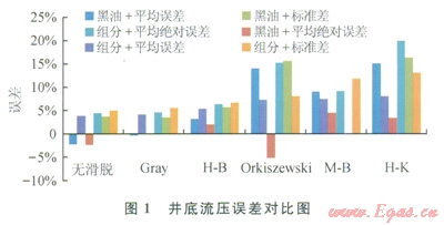 從統(tǒng)計(jì)誤差看,Gray模型各項(xiàng)最小(圖3),組分模型計(jì)算誤差略大于黑油模型。這是由于Gray模型的持液率計(jì)算過(guò)程中考慮了凝析油的反凝析現(xiàn)象,而組分模型再引入相態(tài)方程,使凝析現(xiàn)象疊加導(dǎo)致組分模型計(jì)算壓力較黑油模型對(duì)中性略差,誤差增加。因此推薦Gray模型按黑油模型計(jì)算凝析氣井井筒壓力。