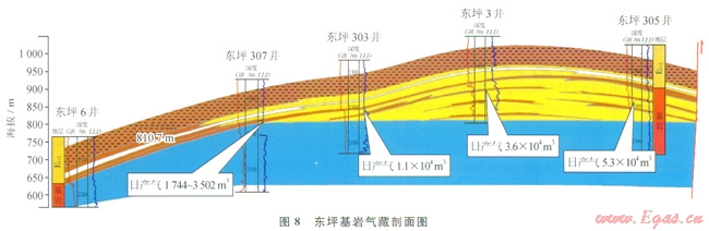 在流體識(shí)別、儲(chǔ)層參數(shù)計(jì)算、有效厚度確定的基礎(chǔ)上,通過多井對(duì)比,對(duì)氣藏有如下認(rèn)識(shí):基巖氣藏為雙重孔隙結(jié)構(gòu),氣藏內(nèi)部受裂縫發(fā)育,后期巖脈侵入等影響,縱向及平面上均表現(xiàn)出一定的非均質(zhì)性,北部的3井區(qū)和南部的l井區(qū)基巖段均為底水塊狀氣藏,基巖氣藏上部和側(cè)向與斷層下盤對(duì)接的地層為E1+2致密泥巖層及膏巖層,對(duì)厚層基巖氣藏起到了很好的封堵作用(圖8)。