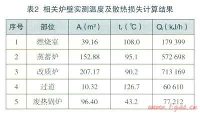 吳煤公司的天然氣改質(zhì)爐是常壓改質(zhì)爐,該工藝過(guò)程的熱效率76.37%,生產(chǎn)城市燃?xì)庑?span lang="EN-US">84.74%。對(duì)照國(guó)內(nèi)常壓改質(zhì)爐生產(chǎn)數(shù)據(jù),屬于較好水平生產(chǎn)燃?xì)?。這種能源轉(zhuǎn)換設(shè)備不同于其他燃?xì)馍a(chǎn)設(shè)備,無(wú)固體灰渣排出,因此,熱量損失評(píng)價(jià)可以從排煙熱損失(顯熱損失和化學(xué)不完全燃燒熱損失)及爐肇散熱損失進(jìn)行考察。測(cè)試數(shù)據(jù)顯示,僅有部分爐體外壁溫度有所偏高,較易克服以減少熱量損失。從占熱量損失的比值來(lái)看分別為機(jī)械發(fā)生爐為45%,鍋爐為59.53%,天然氣改質(zhì)爐為18.52%,由此可見(jiàn),天然氣改質(zhì)爐的能源轉(zhuǎn)換和熱量利用最好。
