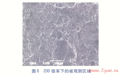 掃描電鏡為JSM—6490LV型掃描電子顯微鏡,采用20kV加速電壓,在真空條件下對壓力實驗336h后且進(jìn)行交流阻抗實驗后的涂層進(jìn)行掃描,在放大倍率為200、500的情況下觀察涂層的表面形貌(分別見圖6、7)。由圖6、7可知,被觀測區(qū)域有一個腐蝕形成的不規(guī)則凹坑(顏色較深部分),但腐蝕并不嚴(yán)重。
