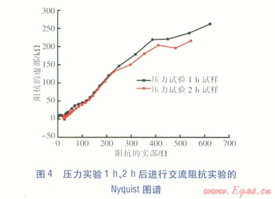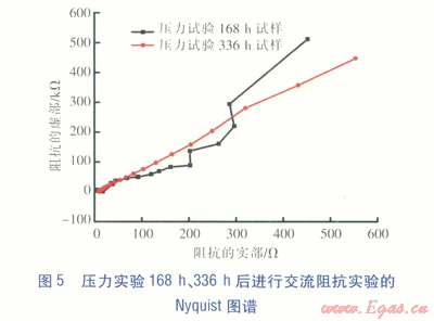 實驗?zāi)康氖菧y試涂層對基材的保護能力。交流阻抗實驗選用的儀器為電化學(xué)測試用PARSTAT2273電化學(xué)工作站,采用經(jīng)典一三電極體系:參比電極為飽和甘汞電極(SCE),輔助電極為鉑電極,帶涂層的基材為工作電極。分別對實驗時間為1h、2h、168h、336h的壓力實驗試件進(jìn)行交流阻抗實驗[3],實驗數(shù)據(jù)采用ZsimpWin軟件擬合,并擬合出Nyquist圖譜(見圖4、5)。圖4、5并未出現(xiàn)文獻(xiàn)[4]提供的曲線形態(tài)(該曲線形態(tài)表征腐蝕物穿透涂層,對基材造成損害)可得到以下結(jié)論:涂層有效阻擋了天然氣腐蝕性物質(zhì)向基材的擴散。