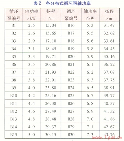 對于分布式循環(huán)泵供熱系統(tǒng),將零壓差點(diǎn)設(shè)定在熱源出口。熱源循環(huán)泵的質(zhì)量流量與傳統(tǒng)供熱系統(tǒng)循環(huán)泵質(zhì)量流量一致,為1290t/h;揚(yáng)程僅用于克服熱源內(nèi)部水頭損失,因此熱源循環(huán)泵揚(yáng)程為15m。經(jīng)計(jì)算,設(shè)計(jì)工況下熱源循環(huán)泵軸功率為75.3kW。分布式循環(huán)泵的質(zhì)量流量為其所在支路熱力站的質(zhì)量流量,揚(yáng)程用于克服熱力站的水頭損失,以及熱力站之前的一切管網(wǎng)水力損失。經(jīng)計(jì)算,設(shè)計(jì)工況下各分布式循環(huán)泵的軸功率見表2。