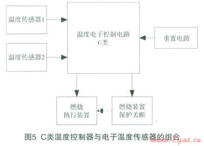 如圖5,這種設(shè)計沒有一個最后的獨立保護裝置,安全依賴于系統(tǒng)安全完整性(參考文獻[2])的要求保證。其中一個溫度傳感器設(shè)在燃燒器(或熱交換器),另一個在輸出熱水端。當其中一路溫度傳感器或其檢測電路失效,另一路可以被監(jiān)測并保護。于采用全電子控制器來實現(xiàn)溫度控制功能,該電子控制器必須按照C類電子控制器的要求來設(shè)計,軟件也必須符合C類軟件要求,這樣使整體符合C類安全要求。