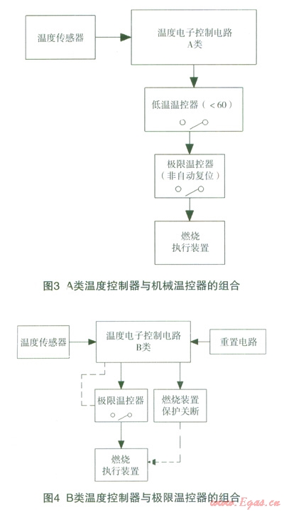 如圖3,這是一個傳統(tǒng)的解決方法,使崩了機械控溫的組合,即由溫度控制(溫度調(diào)節(jié)器)和防止溫度過熱風(fēng)險(溫度限定器)構(gòu)成,具體要求可參見器具標準(例女HEN297、EN483)的內(nèi)容要求。機械溫控結(jié)構(gòu)是由多年實踐而產(chǎn)生的并依賴冗余技術(shù)作為原理,被認為是安全的,不需要控制器另外采取特別的措施。此處A類溫度控制電子電路與低溫溫控器可以相當于一個機械的溫度凋節(jié)器。