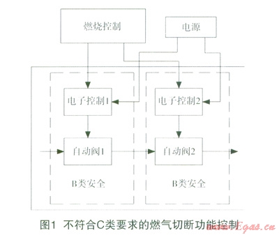 第一,兩個閥門的控制均符合B類安全要求,但組合是不能達到C安全要求的,如圖1。從閥門組合的容錯上分析,當其中一個閥門失控(如有雜物或卡死),另一個閥能保持正常即可符合安全要求。例如,自動閥2失控,自動閥1必須保證安全。B類安全的要求是電子控制1在第一個故障的條件下保證安全狀態(tài),但該故障可能不被檢測到,當?shù)诙€故障仍出現(xiàn)在電子控制1時,電子控制1可能導(dǎo)致自動閥1不受控,這樣兩個閥都不受控,所以不符合C類安全要求。