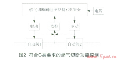 第二,兩個閥門同時由符合C類安全的電子控制器控制,整體可以達C安全要求,如圖2。當自動閥1失效,如果電子控制器符合C類安全,自動閥2在任意兩個故障的條件下均可以保證處于安全狀態(tài),所以整體符合C類安全要求。按照這種分析,自動閥1、2是可以同時驅(qū)動的(并聯(lián))。所以閥的冗余與閥驅(qū)動的冗余是安全設(shè)計兩個方面,都必須要做到。