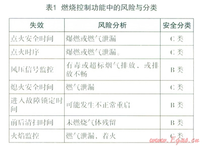 火焰監(jiān)控通常與燃氣切斷功能關(guān)聯(lián),所以燃燒控制功能屬于C類安全。如果燃燒控制不包括火焰監(jiān)控功能,僅是一些時序與邏輯的控制,其功能安全可根據(jù)失效后果歸為B類,具體可參見表1。