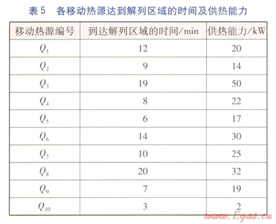 移動(dòng)熱源(Q1~Q10)至解列區(qū)域M的出救路線見圖4。各移動(dòng)熱源達(dá)到解列區(qū)域的時(shí)間及供熱能力見表5。設(shè)解列區(qū)域的最低限額供熱量為50kW,考慮移動(dòng)熱源到達(dá)解列區(qū)域時(shí)間以及式(2),得到出救移動(dòng)熱源順序?yàn)?/span>Q10、Q5、Q9、Q4,即解列區(qū)域恢復(fù)供熱的最短時(shí)間為8min。考慮移動(dòng)熱源供熱能力后,最優(yōu)出救移動(dòng)熱源順序?yàn)?/span>Q5、Q9、Q4,此時(shí)解列區(qū)域恢復(fù)供熱的最短時(shí)間仍為8min。由算例可知,通過優(yōu)化在出救時(shí)間最短標(biāo)準(zhǔn)不變的條件下,出救移動(dòng)熱源數(shù)量減少,從而提高了移動(dòng)熱源出救的經(jīng)濟(jì)性。