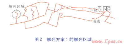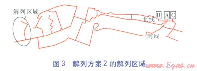 按照解列最不利熱用戶的原則,并根據(jù)閥門設(shè)置情況,選取解列方案1、2。兩種解列方案中解列區(qū)域分別見圖2、3。解列方案1、2的解列區(qū)域分別包括15、34個(gè)熱用戶,被解列熱用戶總設(shè)計(jì)質(zhì)量流量分別為1030、2220t/h。解列區(qū)域最低限額供熱系數(shù)仍取0.807,則解列方案1、2的解列區(qū)域事故工況下的質(zhì)量流量分別為832、1792t/h。