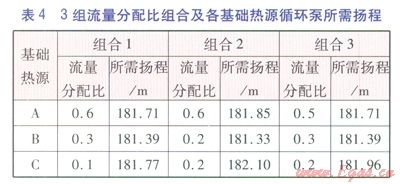 根據(jù)各基礎(chǔ)熱源設(shè)計(jì)質(zhì)量流量,經(jīng)計(jì)算可得,基礎(chǔ)熱源A~C的流量分配比限額(最大值)分別為0.6、0.3、0.2。在南線出口事故工況下,按照10%步長(zhǎng)改變各基礎(chǔ)熱源流量分配比,可得到3組流量分配比組合。按照文獻(xiàn)[8]的計(jì)算方法,分別計(jì)算3組流量分配比組合中各基礎(chǔ)熱源循環(huán)泵所需揚(yáng)程。3組流量分配比組合及各基礎(chǔ)熱源循環(huán)泵所需揚(yáng)程見表4。