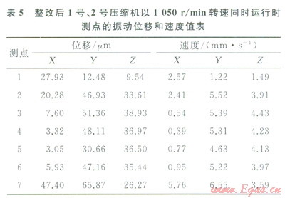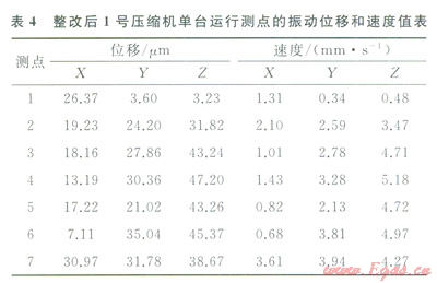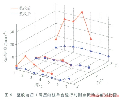 按照圖3的整改參數(shù)完成了工藝管線的現(xiàn)場整改,整改前后現(xiàn)場如圖4所示。為評價減振理效果,完成了1號壓縮機(jī)單臺運(yùn)行和1號、2號壓縮機(jī)同時運(yùn)行兩種工況的現(xiàn)場測試。測點(diǎn)的布置情況如圖4所示,測點(diǎn)的方向與整改前一致,其中1號壓縮機(jī)單臺運(yùn)行參數(shù)及測點(diǎn)的振動位移和速度值分別見表3、4,1號、2號壓縮機(jī)同時運(yùn)行時測點(diǎn)的振動位移和速度值見表5,整改前后l號壓縮機(jī)單臺運(yùn)行時測點(diǎn)振動速度對比圖如圖5所示。