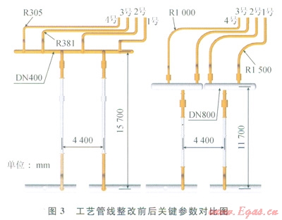 結(jié)合現(xiàn)場實(shí)際,從消減激振力{F}、管線設(shè)計相關(guān)標(biāo)準(zhǔn)和現(xiàn)場操作工藝方面綜合分析,確定了如下的治理措施:①考慮設(shè)備檢修和倒流程操作,采用2個獨(dú)立的匯氣管,2個匯氣管出口分別連接到1號、2號和3號、4號壓縮機(jī);②按照一般匯氣管的流通面積應(yīng)大于進(jìn)氣管流通面積總和3倍的要求,增加匯氣管直徑和緩沖容積[12];③減少彎頭以及增加彎頭的曲率半徑;④縮短管線長度以增加管線剛度、合理布置支承。工藝管線整改前后關(guān)鍵參數(shù)對比如圖3所示。