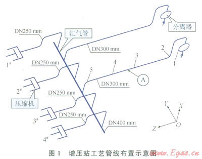 某增壓站是一座集采、集、輸、增壓功能為一體的大型集輸站,設(shè)計處理規(guī)模為183×104m3/d,設(shè)計壓力為8.0MPa。壓縮機(jī)組由3臺(1號、2號、3號)功率為1250kW和1臺(4號)功率為1030kW的大型往復(fù)式壓縮機(jī)組成,壓縮機(jī)結(jié)構(gòu)為水平對稱平衡型,采用燃?xì)獍l(fā)動機(jī)驅(qū)動。增壓站工藝管線布置情況如圖1所示,分離器出口管道與匯氣管連接,匯氣管出口管道與壓縮機(jī)連接。增壓站自投運(yùn)以來,壓縮機(jī)組運(yùn)行參數(shù)達(dá)到設(shè)計要求,但管道系統(tǒng)振動異常,無法運(yùn)行多臺壓縮機(jī)組,嚴(yán)重制約了生產(chǎn)產(chǎn)量。雖采取了強(qiáng)化管道支承、加固連接底座等減振措施,但減振效果不佳。