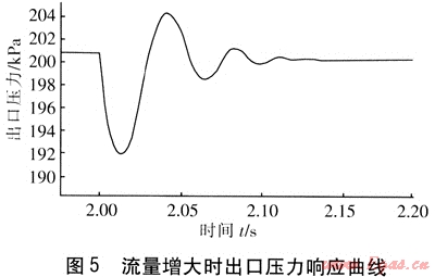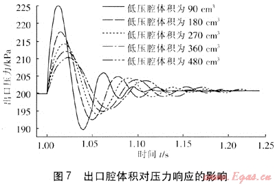 低壓腔體積分別為90、180、270、360和480cm3時,在t=1.00s時刻突然減小閥門開度,流量突然減小,出口壓力的動態(tài)響應(yīng)曲線見圖7??梢钥吹剑谝欢ǚ秶鷥?nèi),隨著低壓腔體積的增加,超調(diào)量逐漸減小,而對過渡時間的影響不大。