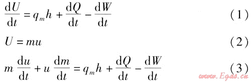 容積模型是一個開式系統(tǒng)模型,根據(jù)熱力學(xué)第一定律計(jì)算容積內(nèi)溫度、壓力和氣體質(zhì)量的變化[5]。此模型應(yīng)用于調(diào)壓器模型的高壓腔、低壓腔和控制腔,模型為: