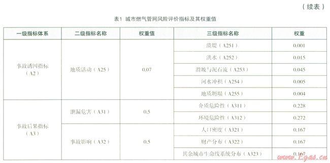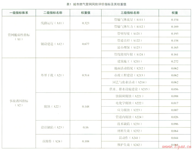 城市管網(wǎng)風(fēng)險(xiǎn)因素間權(quán)重的選擇,參考國(guó)內(nèi)外經(jīng)驗(yàn)[6],[8],各指標(biāo)權(quán)重分配見表1。
