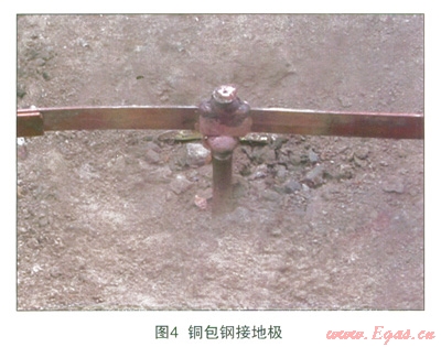 根據(jù)GB/T 50235—2010《工業(yè)金屬管道工程施工及驗收規(guī)范》中對防靜電和防雷電的要求,對于露空的閥門、閘井中的閥門應(yīng)該進行接地處理。在接地時,為了有效地降低與土壤的接觸電阻和接地材料的自身腐蝕,往往會使用銅包鋼或者銅網(wǎng)等惰性材料接地方式,如圖4所示。