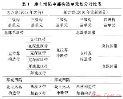 由于當(dāng)時(shí)勘探程度低,原構(gòu)造單元?jiǎng)澐址桨笇?duì)控制區(qū)帶劃分的其他因素考慮甚少。近年來(lái),隨著油氣勘探的深入,尤其是構(gòu)造建模研究、區(qū)域構(gòu)造演化研究、油氣成藏研究取得重要進(jìn)展,構(gòu)造單元?jiǎng)澐址桨敢舶l(fā)生了改變。因此,筆者根據(jù)目前的研究成果對(duì)庫(kù)車坳陷中部構(gòu)造單元重新進(jìn)行劃分。