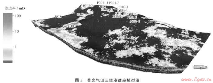 普光氣田儲集空間類型多樣,以孔隙為主,局部發(fā)育裂縫??紫抖群蜐B透率的關(guān)系受多種因素的控制,相關(guān)性不好。為此,在建立滲透率模型時分兩步進行:①由于儲層孔隙類型不同導致孔隙度與滲透率關(guān)系多樣化,在計算滲透率模型時,首先通過單井測井曲線聲波與密度的相對幅度差判斷孔隙結(jié)構(gòu)類型,按照不同孔隙結(jié)構(gòu)類型的孔滲關(guān)系式,由各井測井孔隙度計算出單井各層面不同孔隙類型的滲透率;②由于裂縫的存在,孔隙度變化不大,而滲透率卻成倍增大,因而在對滲透率模型計算時引入裂縫指數(shù)數(shù)據(jù)體對滲透率進行裂縫校正。