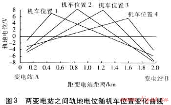 雜散電流的變化與雜散電流源的變化具有一致性,軌交雜散電流的大小隨軌交系統(tǒng)的用途、機(jī)車的相對位置和運行狀態(tài)不同而變化。機(jī)車在每兩個站臺之間都要經(jīng)歷加速、勻速、減速的過程,不同運行狀態(tài)下機(jī)車電流不同。隨機(jī)車電流及機(jī)車位置的變化,軌道電流和軌道對地電位(簡稱軌地電位)也處于變化中,圖3為兩變電站之間軌地電位隨機(jī)車位置變化曲線。軌地電位為正時,雜散電流流入大地,軌地電位為負(fù)時,雜散電流返回鋼軌。鋼軌泄漏電流位置的變化使得埋地管道對地電位(簡稱管地電位)處于不斷變化之中,管道發(fā)生雜散電流腐蝕的位置和強(qiáng)度也在不斷變化[8]。